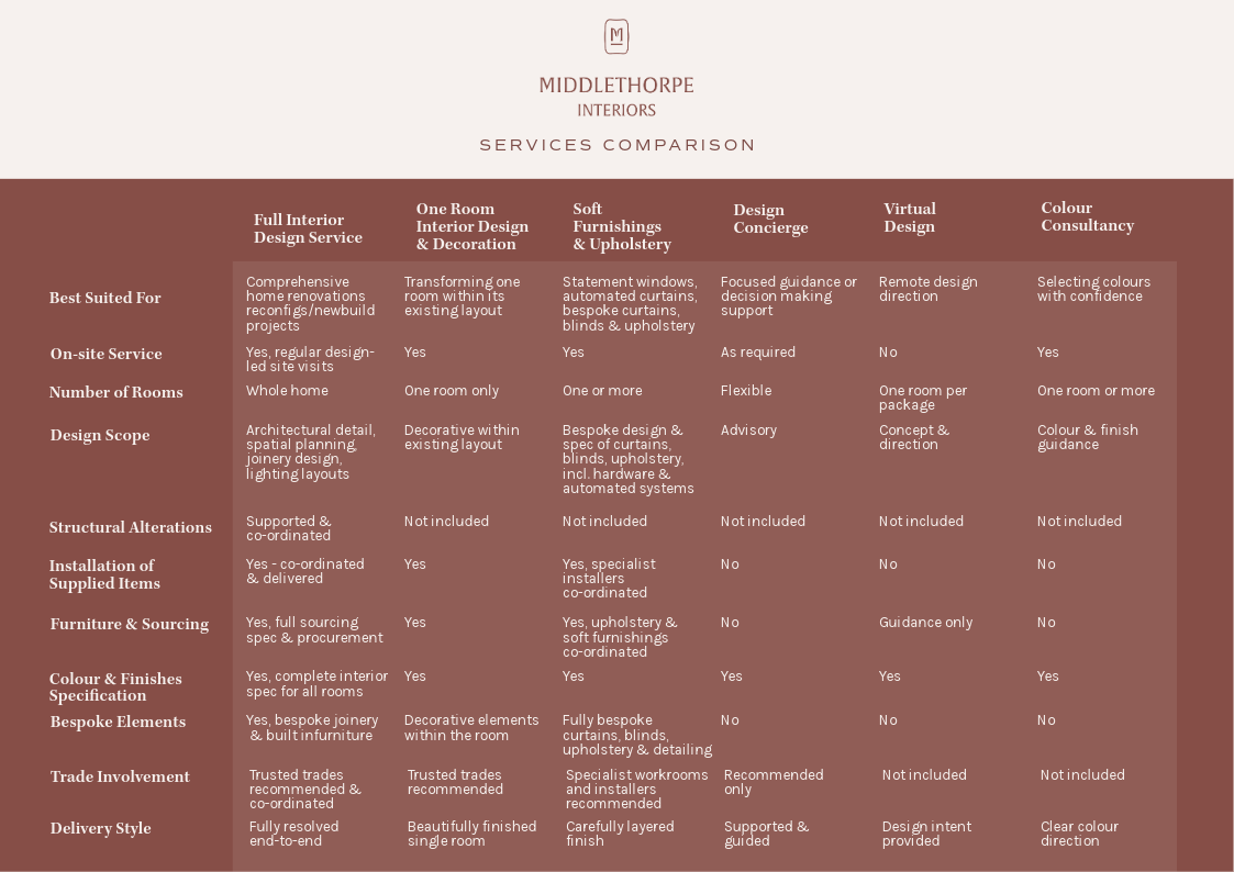 We have created a clear service comparison guide to help you navigate the various ways you can work with Middlethorpe Interiors — from Full Interior Design to advisory support through Design Concierge.